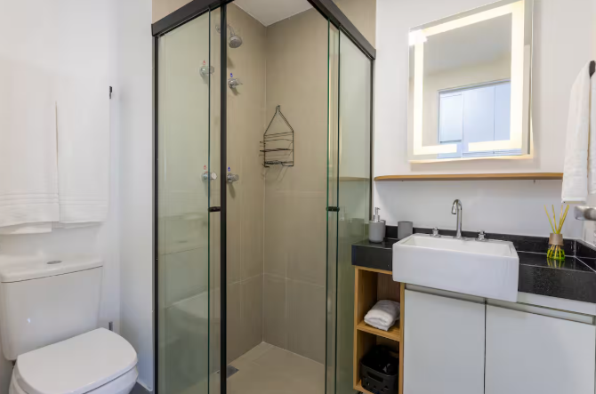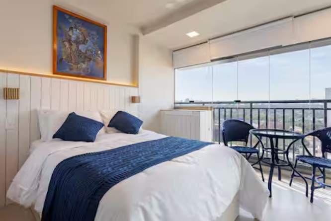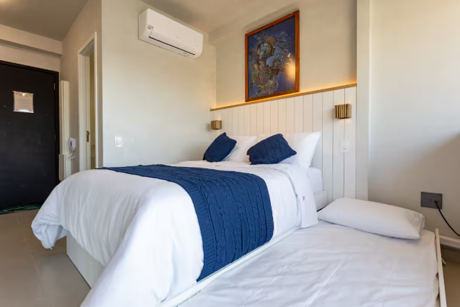 O quarto acomoda até 3 hóspedes, com uma cama de casal aconchegante e um colchão que garante conforto extra. O ambiente foi pensado nos mínimos detalhes para oferecer uma estadia agradável: ar-condicionado, Wi-Fi rápido e uma decoração clean que mistura funcionalidade e estilo.