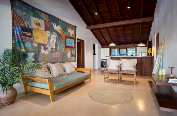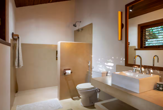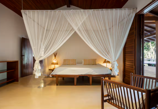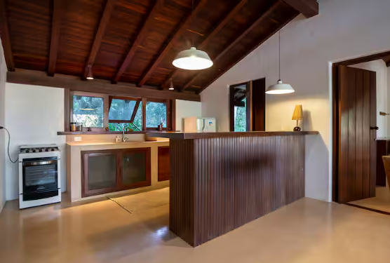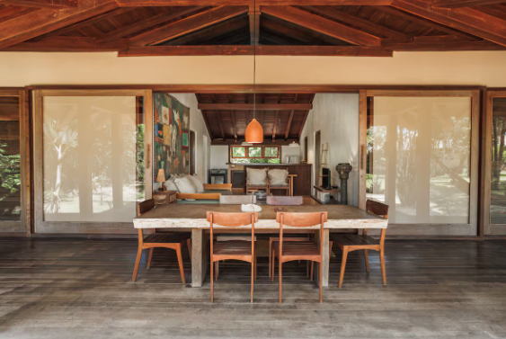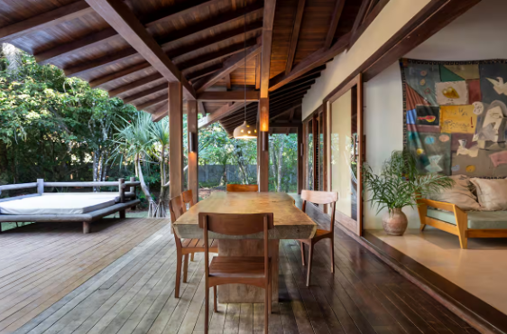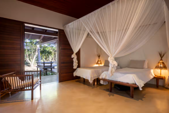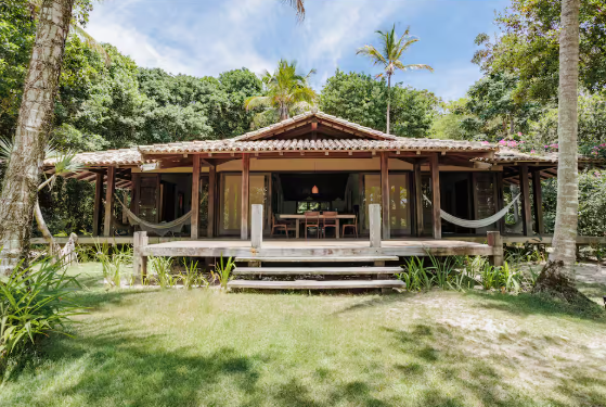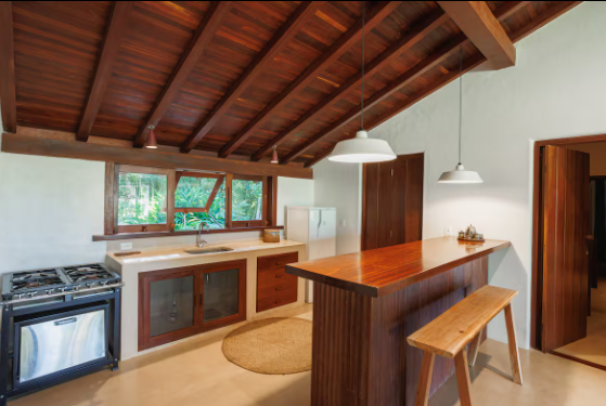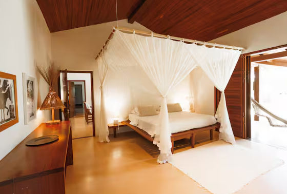 Suíte 1, varanda, com rede, varanda, cama king size, mosquiteiro, ar condicionado e closet. Suíte 2, idêntica à suíte 1 Cozinha com 1 geladeira, fogão, despensa e armários. Rodeado por um grande deck que anda ao redor da casa e contém dois sofás solário em sua frente, tem uma sala de estar com cozinha americana, similar e TV. Fora da sala de estar, na parte coberta do deck da varanda, há uma grande mesa de jantar feita de um único pedaço de madeira rústica. A casa fica a 100 mts da praia, onde há um gazebo privado com cadeiras de rede e chaise longues. Os serviços incluem limpeza diária e um cozinheiro qualificado que prepara café da manhã e almoço. Mediante solicitação, também fornecemos serviços de concierge para comprar alimentos e bebidas e organizar viagens e atividades locais.